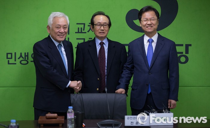 (서울=포커스뉴스) 25일 오후 서울 마포구 국민의당 당사에서 열린 제1차 공직선거후보자추천관리위원회에서 전윤철(중앙) 국민의당 공천관리 위원장이 천정배 공동대표(오른쪽) 와 김한길 의원과 손을 잡고 있다.
