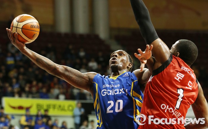 (안양=포커스뉴스) 25일 안양실내체육관에서 열린 2015-2016 프로농구 6강 플레이오프 KGC-삼성 1차전에서 삼성 라틀리프가 KGC 찰스 로드의 블로킹을 제치며 레이업슛을 시도하고 있다.