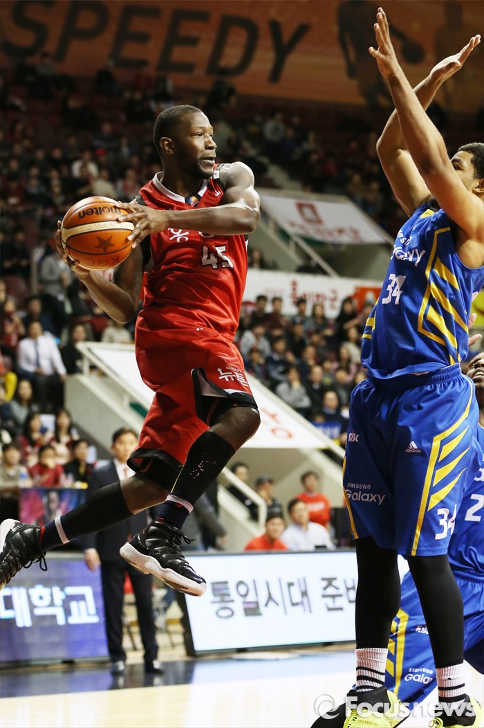 (안양=포커스뉴스) 25일 안양실내체육관에서 열린 2015-2016 프로농구 6강 플레이오프 KGC-삼성 1차전에서 KGC 마리오 리틀이 삼성 에릭 와이즈의 마크를 받으며 패스를 시도하고 있다.