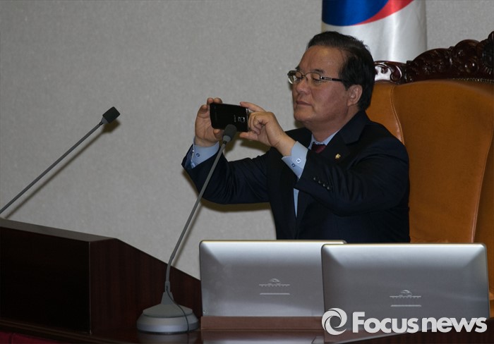 (서울=포커스뉴스) 테러방지법 직권상정에 반발해 야당의 무제한 토론(필리버스터)이 나흘째 진행되고 있는 26일 오전 서울 여의도 국회 본회의장에서 정갑윤 국회 부의장이 핸드폰으로 촬영을 하고 있다.