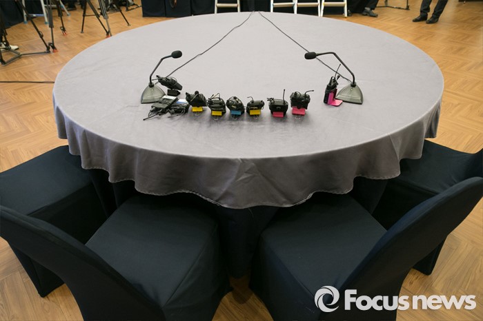 (서울=포커스뉴스) 선거구획정과 쟁점법안 논의를 위한 여·야 대표, 원내대표 2+2 회동이 무산된 26일 오전 서울 여의도 국회 귀빈식당에 취재를 위한 마이크만 놓여 있다.