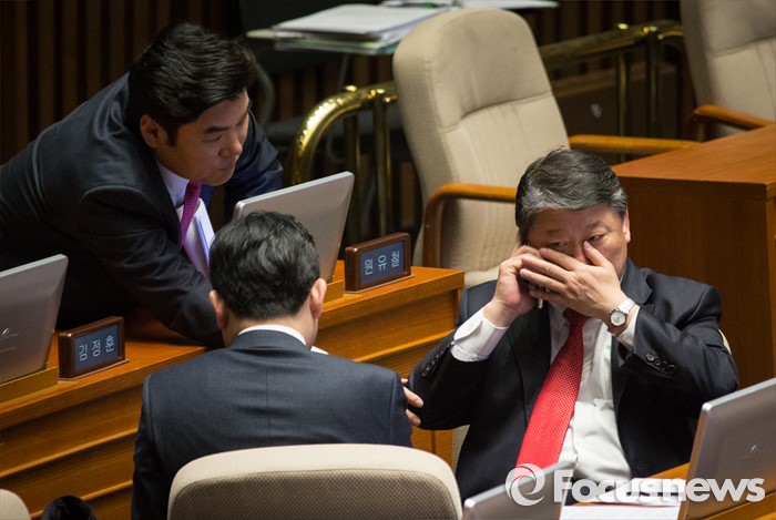 (서울=포커스뉴스) 테러방지법 직권상정에 반발해 야당의 무제한 토론(필리버스터)이 나흘째 진행되고 있는 26일 오전 서울 여의도 국회 본회의장에서 원유철 새누리당 원내대표가 은밀히 통화하는 조원진 원내수석부대표를 조용히 불러내고 있다.
