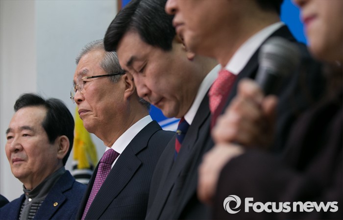 (서울=포커스뉴스) 김종인(왼쪽 두번째) 더불어민주당 비대위 대표, 이종걸(오른쪽 세번째) 원내대표가 26일 오전 서울 여의도 국회에서 비대위-선대위 연석회의에 앞서 부실부채 탕감 퍼포먼스를 마친 뒤 한 참석자의 주빌리은행 상담사례를 듣고 있다.