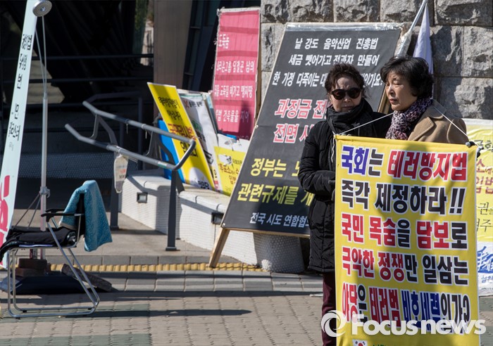 (서울=포커스뉴스) 26일 오전 서울 여의도 국회 정문 앞에서 나라사랑 어머니연합 회원들이 테러방지법 제정을 요구하는 팻말을 들고 있다.