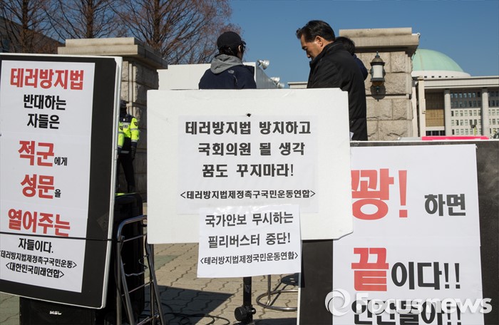 (서울=포커스뉴스) 26일 오전 서울 여의도 국회 정문 앞에서 보수단체 회원들이 테러방지법 제정을 요구하는 팻말을 설치하고 있다.