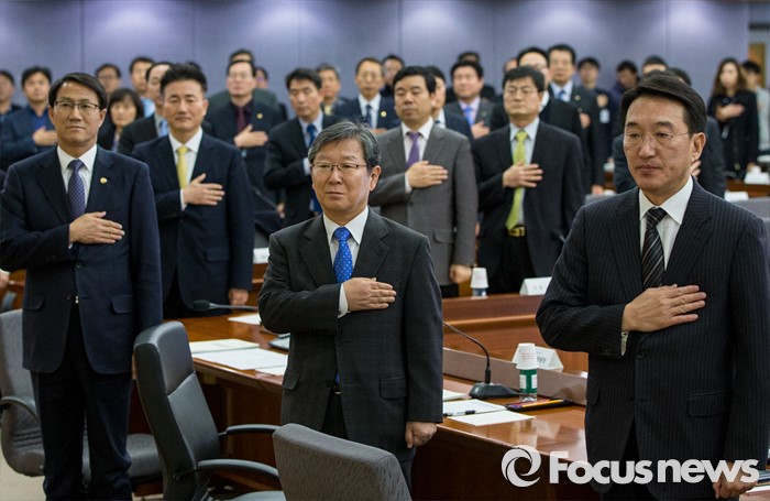(서울=포커스뉴스) 26일 오후 서울 중구 정부서울청사 별관에서 열린 '2016년 제1회 정부3.0 국민체감 성과점검회의'에 참석한 김성렬(맨 앞줄 왼쪽부터) 행정자치부 차관, 송희준 정부3.0추진위원장, 현기환 정무수석을 비롯한 중앙부처, 지자체, 공공기관 관계자들이 국민의례를 하고 있다.