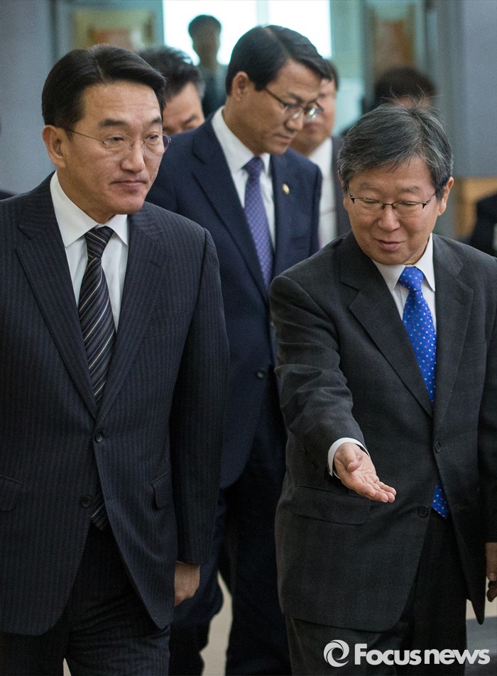 (서울=포커스뉴스) 26일 오후 서울 중구 정부서울청사 별관에서 열린 '2016년 제1회 정부3.0 국민체감 성과점검회의'에 참석한 송희준(오른쪽) 정부3.0추진위원장이 현기환 정무수석에게 자리를 안내하고 있다.