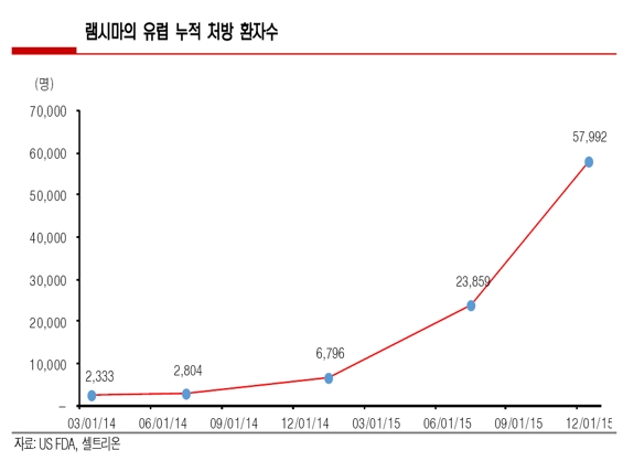 유럽 주요 국가 발매가 이뤄진 2015년에는 누적 처방환자 수 5만7992명으로 1년 동안 환자 수가 약 700% 이상 급증했다.