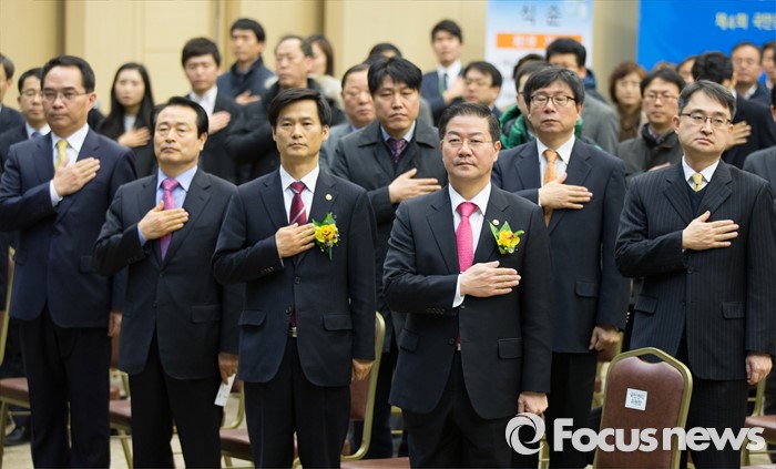 (세종=포커스뉴스) 26일 오후 세종시 정부세종컨벤션센터에서 열린 제4회 국민권익의 날 기념식에서 성영훈 국민권익위원장과 내빈들이 국기에 대한 경례를 하고 있다.