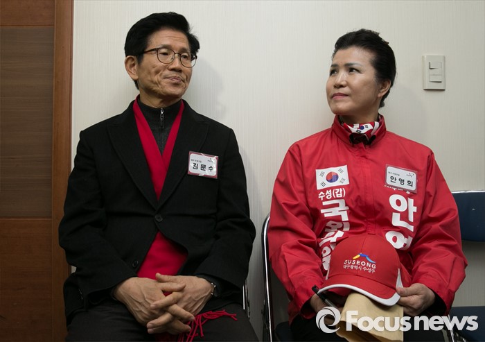 (서울=포커스뉴스) 26일 오후 서울 여의도 새누리당사에서 열린 20대 총선 공천 신청자 면접심사에 참석한 김문수(왼쪽), 안영희 대구 수성갑 예비후보가 면접을 기다리고 있다.