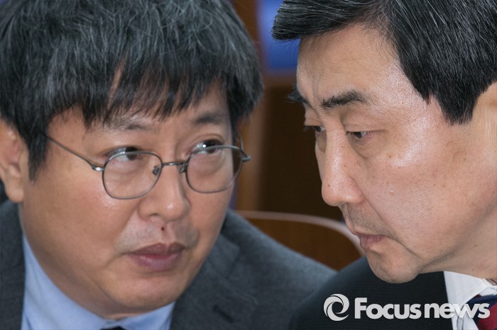 (서울=포커스뉴스) 이종걸(오른쪽) 더불어민주당 원내대표와 이춘석 원내수석부대표가 26일 오후 서울 여의도 국회에서 열린 의원총회에 참석해 대화하고 있다.