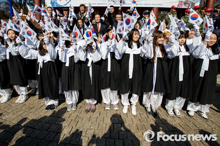 (서울=포커스뉴스) 3.1절을 나흘 앞둔 26일 오후 서울 용산구 효창공원 앞에서 열린 '나라사랑 태극기 만세 행진'에 참가한 성장현 용산구청장을 비롯한 주민들이 태극기를 흔들며 '대한독립 만세'를 외치고 있다.
