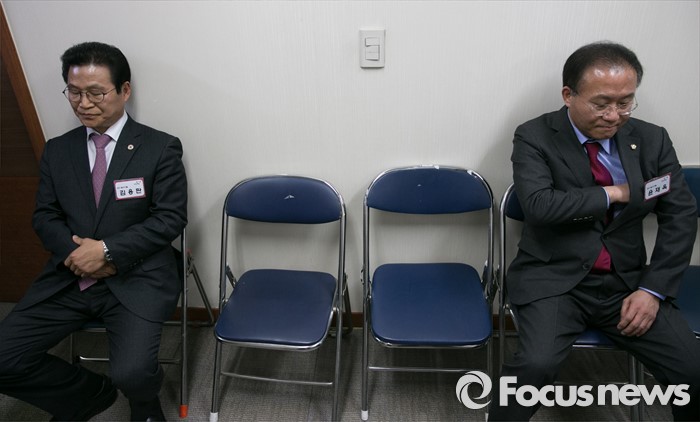 (서울=포커스뉴스) 26일 오후 서울 여의도 새누리당사에서 열린 20대 총선 공천 신청자 면접심사에서 대구 달서을에 신청한 김용판(왼쪽) 전 서울지방경찰청장과 윤재옥 의원이 면접을 기다리고 있다.