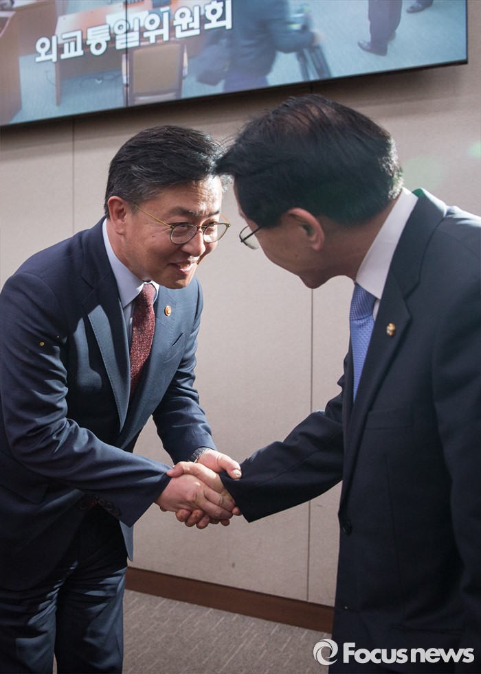 (서울=포커스뉴스) 홍용표(왼쪽) 통일부 장관과 심재권 야당 간사가 26일 오후 서울 여의도 외교통일위원회 전체회의에서 박근혜 정부의 국정 핵심 법안 중 하나인 북한 인권법을 의결한 뒤 악수를 나누고 있다.