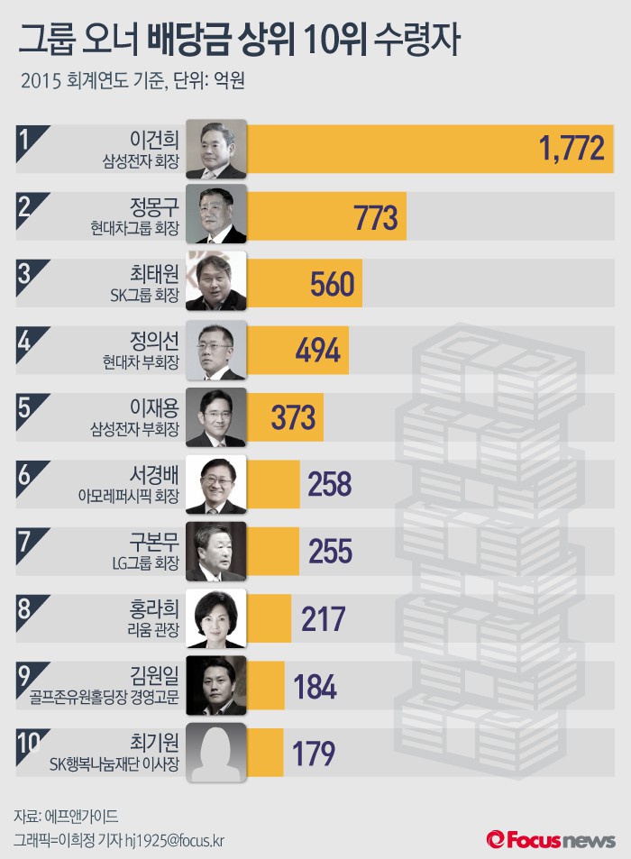 이어 김원일 골프존유원홀딩스 경영고문, 최기원 SK행복나눔재단 이사장 등이 각각 9~10위를 차지했다.(서울=포커스뉴스) 26일 금융정보업체 에프앤가이드가 지난 24일까지 공시된 상장사 현금 배당(보통주 기준) 현황을 집계한 결과 이건희 회장은 1772억원으로 1위를 기록했다.2016.02.26 이희정 기자
