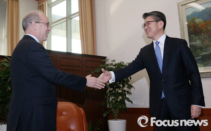 (서울=포커스뉴스) 26일 오후 서울 종로구 외교부 청사에서 대니얼 러셀(왼쪽) 미국 국무부 동아시아태평양담당 차관보와 김홍균 외교부 차관보가 악수하고 있다.