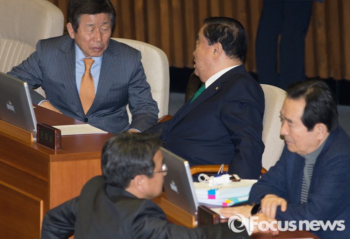 (서울=포커스뉴스) 테러방지법 직권상정에 반발해 야당이 무제한 토론(필리버스터)를 나흘째 진행하고 있는 26일 오후 서울 여의도 국회 본회의장에서 '컷오프'된 문희상(왼쪽 두번째), 유인태(왼쪽 첫번째) 더불어민주당 의원, 공천 배제된 강기정(오른쪽 두번째) 의원이 각각 동료 의원들과 대화하고 있다.