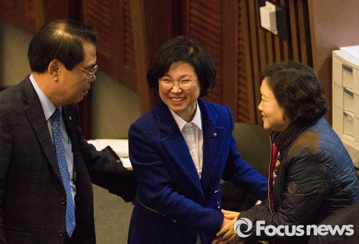 (서울=포커스뉴스) 테러방지법 직권상정에 반발해 야당이 무제한 토론(필리버스터)를 나흘째 진행하고 있는 26일 오후 서울 여의도 국회 본회의장에서 김현(가운데) 더불어민주당 의원이 토론을 마친 뒤 동료 의원들의 격려를 받으며 퇴장하고 있다.
