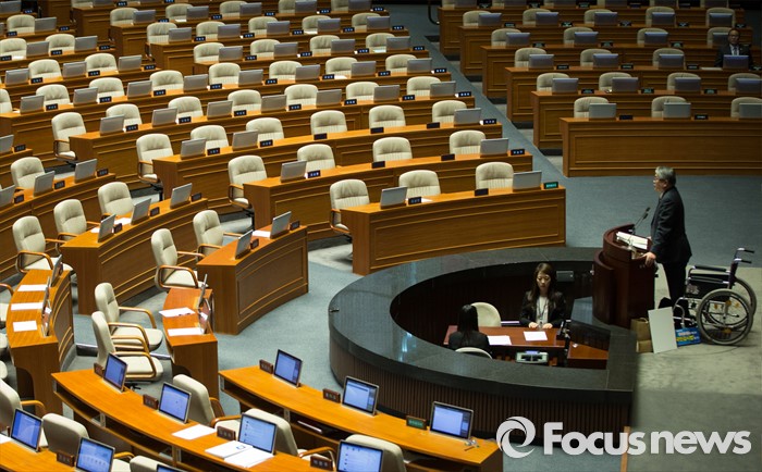 | △ 텅 빈 의석, 휠체어 타고 온 13번째 필리버스터 주자 |