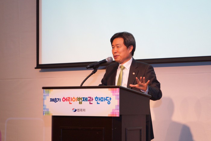 한편 법제처는 전국 초등학교 4~6학년(신학기 기준)을 대상으로 다음달 1일부터 31일까지 제9기 어린이법제관을 신청 받을 예정이다.제정부 법제처장이 26일 서울 영등포구 그랜드컨벤션센터에서 열린 '제8기 어린이법제관 한마당 행사'에서 인사말을 하고 있다. <사진제공=법제처>
