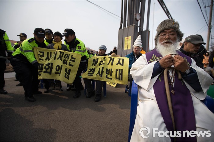 (서귀포=포커스뉴스) 26일 오전 제주 서귀포시 강정마을에서 주민들과 기지 건설을 반대하는 활동가들이 준공식이 열리는 제주 군복합형관광미한(제주해군기지) 정문 앞 부근에서 시위를 하고 있다.