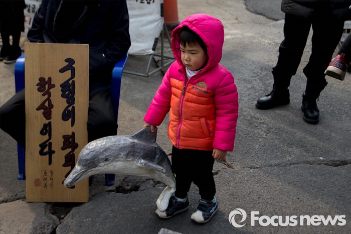 (서귀포=포커스뉴스) 한 아이가 26일 준공식이 열리는 제주 서귀포시 제주민군복합형관광미항(제주해군기지) 정문 앞 부근에서 돌고래 모형을 들고 있다.