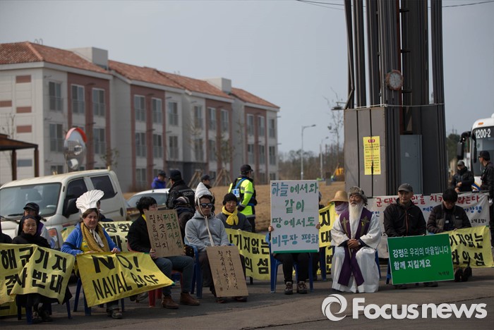 (서귀포=포커스뉴스) 26일 오전 제주 서귀포시 강정마을에서 주민들과 기지 건설을 반대하는 활동가들이 준공식이 열리는 제주 군복합형관광미항(제주해군기지) 정문 앞 부근에서 시위를 하고 있다.