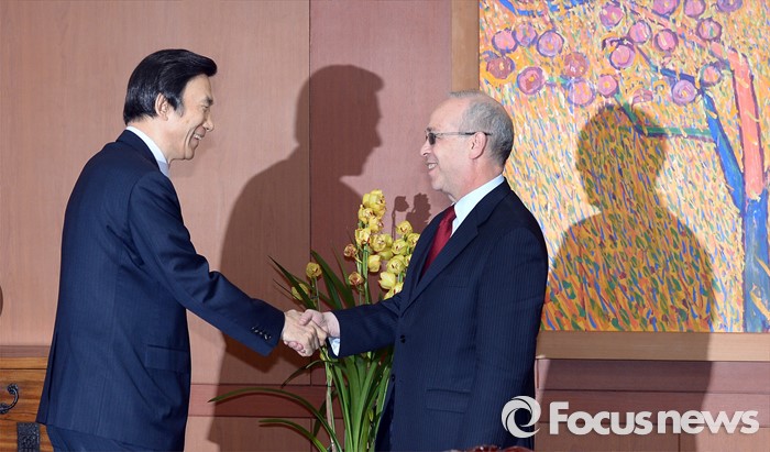 (서울=포커스뉴스) 26일 오후 서울 종로구 외교부 청사에서 윤병세(왼쪽) 외교부 장관과 대니얼 러셀 미국 국무부 동아시아태평양담당 차관보가 악수하고 있다.
