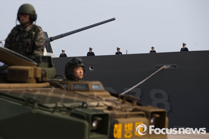 (서귀포=포커스뉴스) 26일 오후 제주 서귀포 제주해군기지에서 열린 '제주민군복합형관광미항' 준공식에 해군 및 해병대 장병들이 도열해있다.