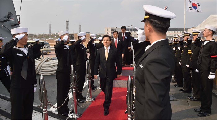 (서울=포커스뉴스) 황교안 국무총리가 26일 오후 제주 서귀포 제주해군기지에서 열린 제주민군복합형관광미항 준공식에 참석해 이지스구축함 서애류성룡함에 승선하고 있다. <사진제공=해군>