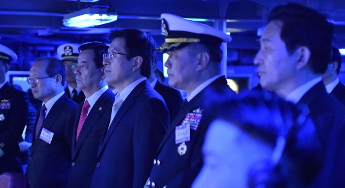 (서울=포커스뉴스) 황교안 국무총리가 26일 오후 제주 서귀포 제주해군기지에서 열린 제주민군복합형관광미항 준공식에 참석해 이지스구축함 서애류성룡함을 둘러보고 있다. <사진제공=해군>