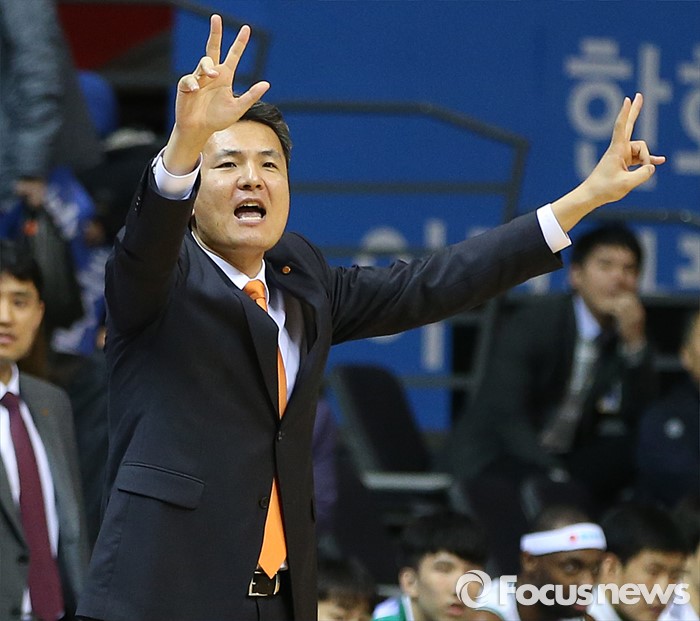 (고양=포커스뉴스) 26일 고양체육관에서 열린 2015-2016 프로농구 오리온-동부 6강 플레이오프 1차전에서 동부 김영만 감독이 선수들에게 작전을 지시하고 있다.