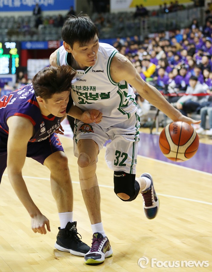 (고양=포커스뉴스) 26일 고양체육관에서 열린 2015-2016 프로농구 오리온-동부 6강 플레이오프 1차전에서 동부 김주성이 오리온 이승현의 마크를 제치며 드리블하고 있다.