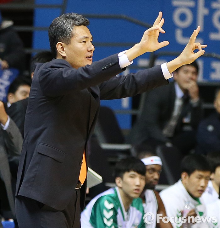 (고양=포커스뉴스) 26일 고양체육관에서 열린 2015-2016 프로농구 오리온-동부 6강 플레이오프 1차전에서 동부 김영만 감독이 선수들에게 작전을 지시하고 있다.