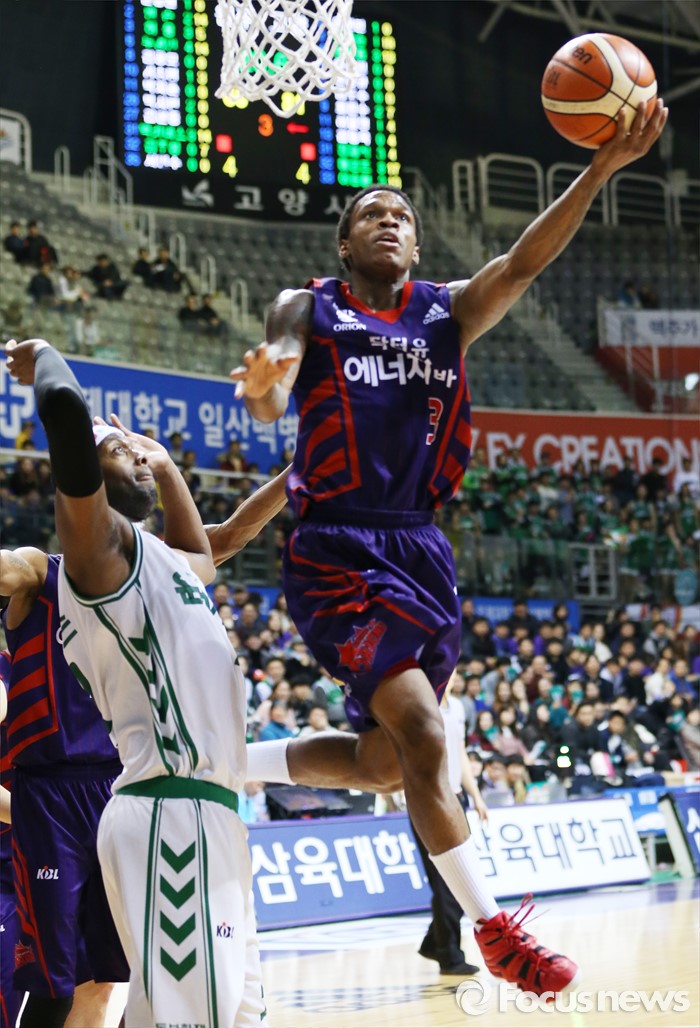 (고양=포커스뉴스) 26일 고양체육관에서 열린 2015-2016 프로농구 오리온-동부 6강 플레이오프 1차전에서 오리온 조 잭슨이 동부 벤슨을 제치며 레이업슛을 시도하고 있다.