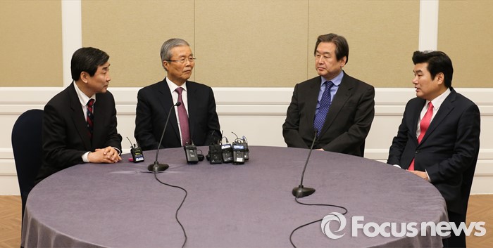 (서울=포커스뉴스) 테러방지법 직권상정에 반발해 야당이 무제한 토론(필리버스터)를 나흘째 진행하고 있는 26일 오후 서울 여의도 국회 귀빈식당에서 선거구 획정 및 쟁점법안 논의를 위해 열린 여야 지도부 회동에 참석한 의원들이 대화를 나누고 있다. 왼쪽부터 이종걸 더불어민주당 원내대표, 김종인 비대위 대표, 김무성 새누리당 대표, 원유철 원내대표.