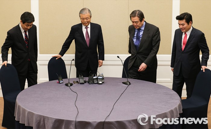 (서울=포커스뉴스) 테러방지법 직권상정에 반발해 야당이 무제한 토론(필리버스터)를 나흘째 진행하고 있는 26일 오후 서울 여의도 국회 귀빈식당에서 선거구 획정 및 쟁점법안 논의를 위한 여야 지도부 회동에 앞서 참석자들이 의자에 앉고 있다. 왼쪽부터 이종걸 더불어민주당 원내대표, 김종인 비대위 대표, 김무성 새누리당 대표, 원유철 원내대표.
