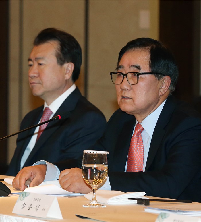 (서울=포커스뉴스) 26일 서울 중구 조선호텔에서 열린 '호텔업계 간담회'에 참석한 유용종(오른쪽) 호텔협회장이 인사말을 하고 있다. <사진제공=문화체육관광부>