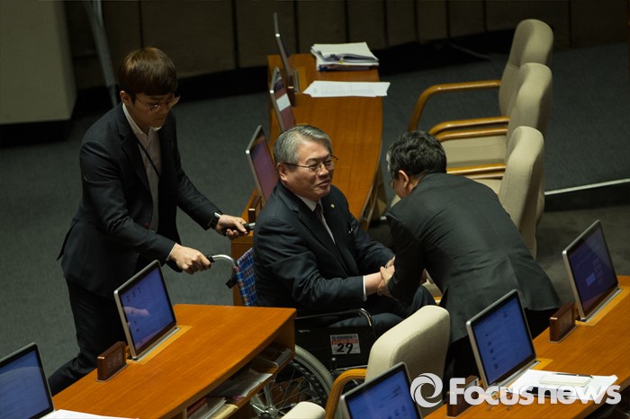 (서울=포커스뉴스) 테러방지법 직권상정에 반발해 야당의 무제한 토론(필리버스터)이 나흘째 진행되고 있는 26일 오후 서울 여의도 국회 본회의장에서 휠체어를 타고 온 김용익 더불어민주당 의원이 발언을 마친 후 동료 의원들에 격려를 받으며 퇴장하고 있다.
