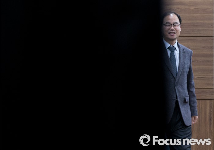 (서울=포커스뉴스) 27일 오후 서울 관악구 중앙선거관리위원회 관악청사에서 선거구획정위 전체회의에 참석한 박영수 선거구획정위원회 위원장이 위원들을 맞이하고 있다.
