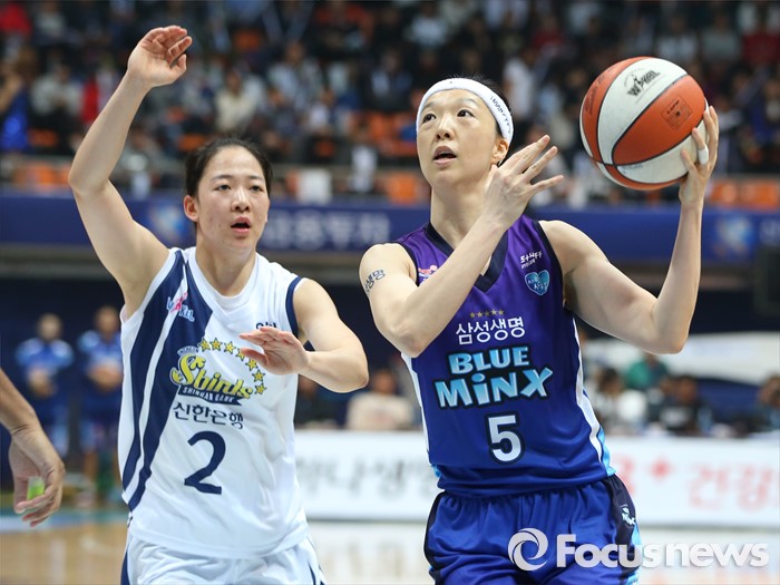 이미선은 지난 1997년 광주 수피아여고를 졸업하고 삼성에 입단한 뒤 19년 동안 뛴 현역 최고참이다.(인천=포커스뉴스) 5일 인천시립체육관에서 열린 2015~2016 여자프로농구 신한은행-삼성생명 경기에서 삼성생명 이미선이 신한은행 김규희의 마크를 따돌리고 골밑슛을 노리고 있다. 2015.11.06 우정식 기자