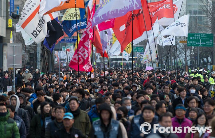 (서울=포커스뉴스) 27일 오후 서울광장에서 민주노총과 참여연대, 전국빈민연합 등 시민사회단체들이 4차 민중총궐기 집회를 마치고 행진하고 있다.