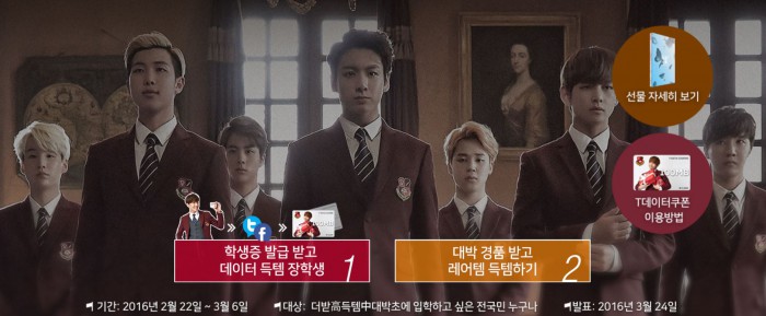 더받高득템中 이벤트는 오는 3월 6일까지 공식 홈페이지에 접속, '온라인 학생증'을 발급받은 후 이벤트 소식 등을 사회관계망서비스(SNS) 공유 하거나 단말기를 구매하는 고객 대상 데이터 쿠폰 및 아이패드, 백팩, 헤드폰, 상품권, 방탄소년단 촬영 소품 등의 경품을 제공한다. 이 외에도 오프라인 매장에서 데이터 쿠폰을 구매한 고객들에게는 데이터 쿠폰 추가 제공 및 설현과 방탄소년단의 한정판 브로마이드 등의 푸짐한 경품을 제공할 예정이다.방탄소년단과 함께하는 'SK텔레콤 득템학교 : 더받고(高)득템중(中)대박초(初)' 이벤트 <사진제공=SK텔레콤>