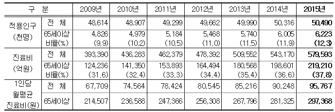 2015년 입내원 1일당 진료비는 5만 8545원으로 전년대비 6.5% 증가했으며, 1인당 월평균진료비도 9만5767원으로 6.1% 늘어났다.