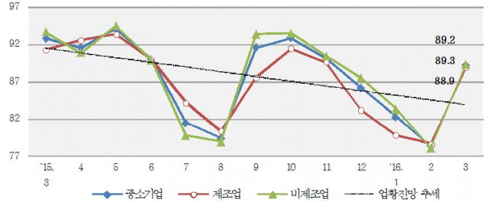 중소기업중앙회는 최근 3150개 중소기업을 대상으로 실시한 '2016년 3월 중소기업 경기전망조사' 결과를 28일 발표했다.