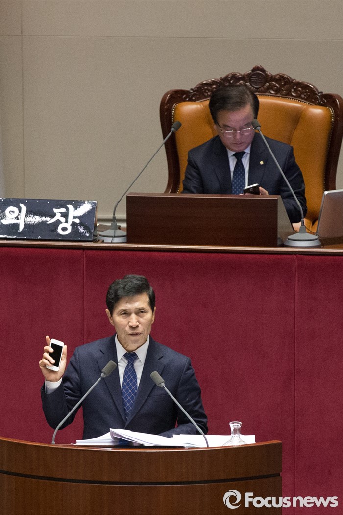 (서울=포커스뉴스) 테러방지법 직권상정에 반발해 야당의 무제한 토론(필리버스터)이 진행되고 있는 28일 오후 서울 여의도 국회 본회의 장에서 23번째 토론에 참여한 이학영 더불어민주당 의원이 발언하며 핸드폰을 보이고 있다.