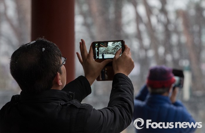 (서울=포커스뉴스) 수도권과 전국 곳곳에에 강한 바람과 함께 기습적인 폭설이 내린 28일 오후 서울 강북구 솔밭공원에서 시민들이 사진을 찍고 있다.