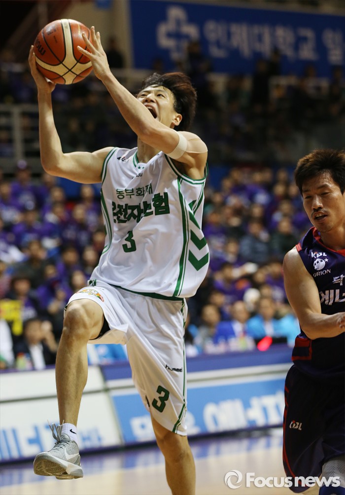 (고양=포커스뉴스) 28일 고양체육관에서 열린 2015-2016 프로농구 오리온-동부 6강 플레이오프 2차전에서 동부 허웅이 오리온 이현민을 제치고 레이업슛을 시도하고 있다.