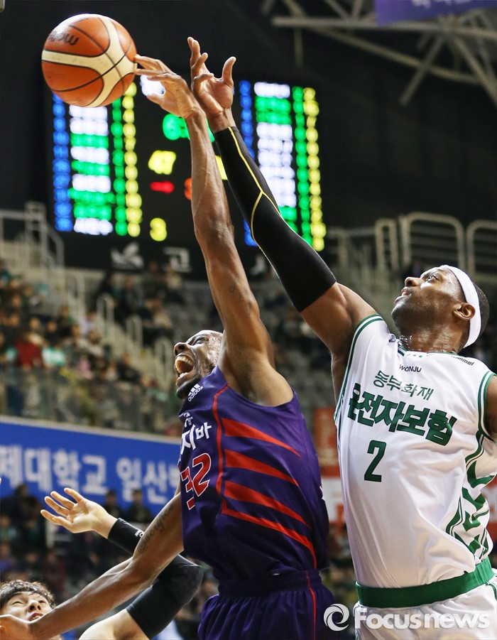 (고양=포커스뉴스) 28일 고양체육관에서 열린 2015-2016 프로농구 오리온-동부 6강 플레이오프 2차전에서 오리온 애런 헤인즈와 동부 벤이 리바운드 다툼을 하고 있다.