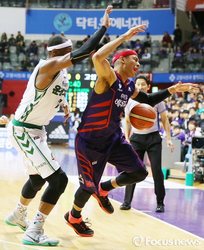 (고양=포커스뉴스) 28일 고양체육관에서 열린 2015-2016 프로농구 오리온-동부 6강 플레이오프 2차전에서 오리온 문태종이 돌파를 시도하다 동부 벤슨과 부딪치며 볼을 놓치고 있다.